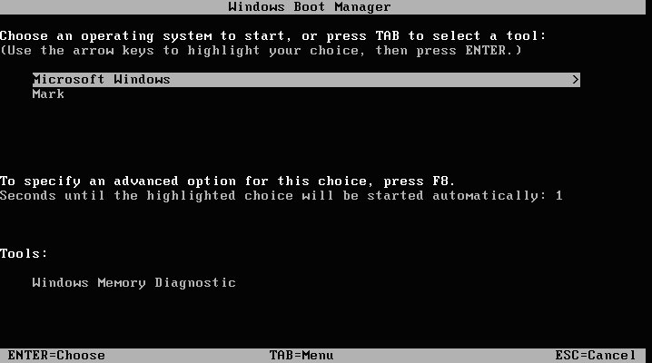 Figure 2 shows what the Windows Boot Manager displays if the BCD contained two entries whose descriptions are "Microsoft Windows" (which is the default name of a Vista install) and "Mark."