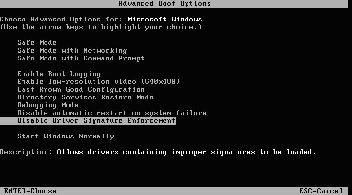When the system restarts, use "F8" to get to the "Advanced Boot Options" menu. Next, select the "Disable Driver Signature Enforcement" option as seen in Figure 3.