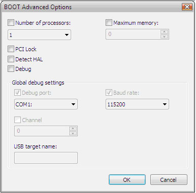 From the BOOT Advanced Options dialog, the user can modify the global debug settings. Notice that I mentioned global debug settings. Unlike previous versions of Windows where each line in the BOOT.INI file could have separate debug options, Vista has one set of debug options that are used by all Vista O/S installations on your machine.